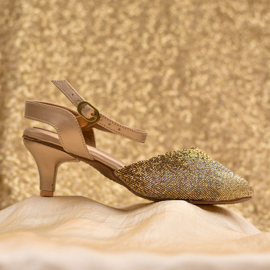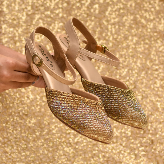 Gold-toned party heels with mirror work and comfort sole