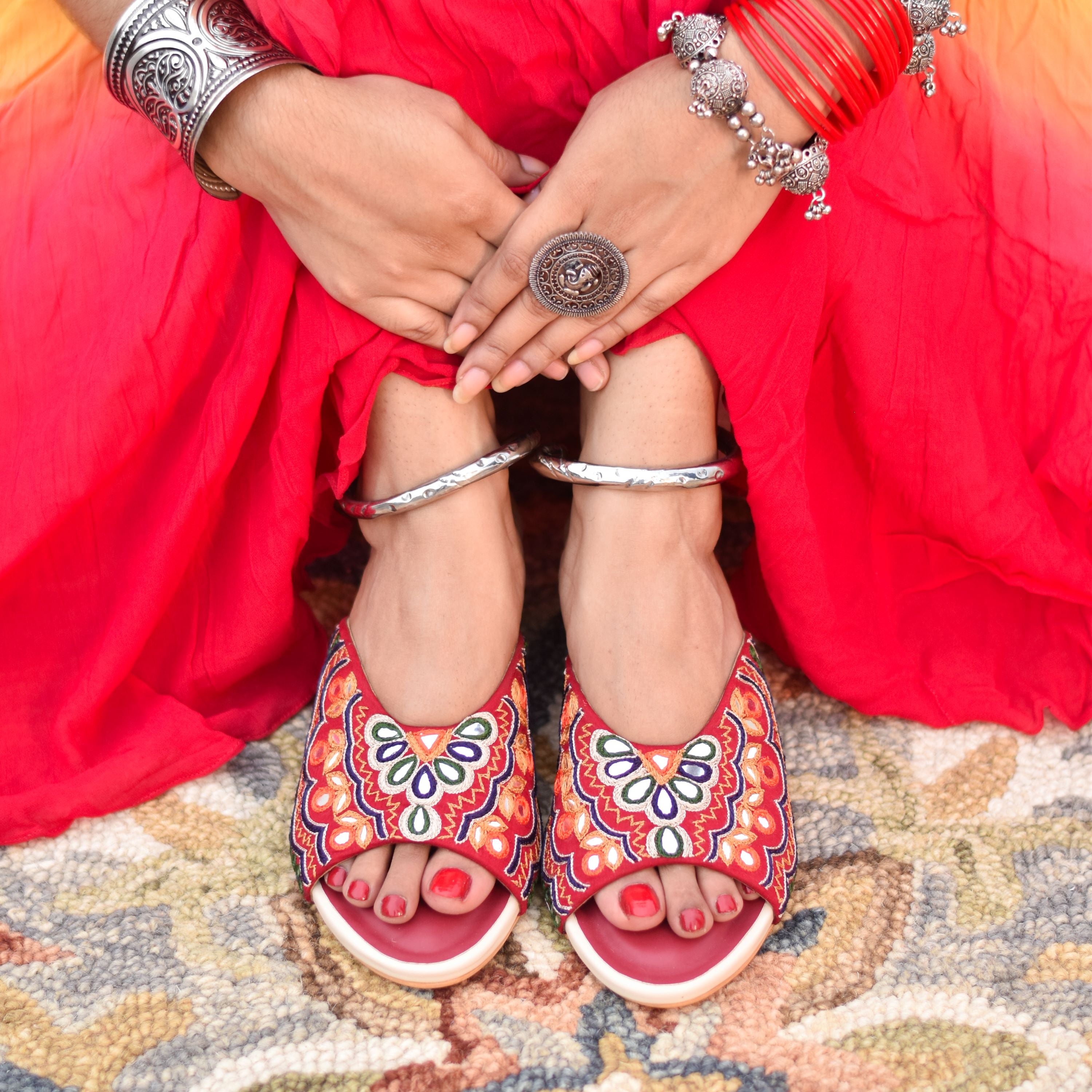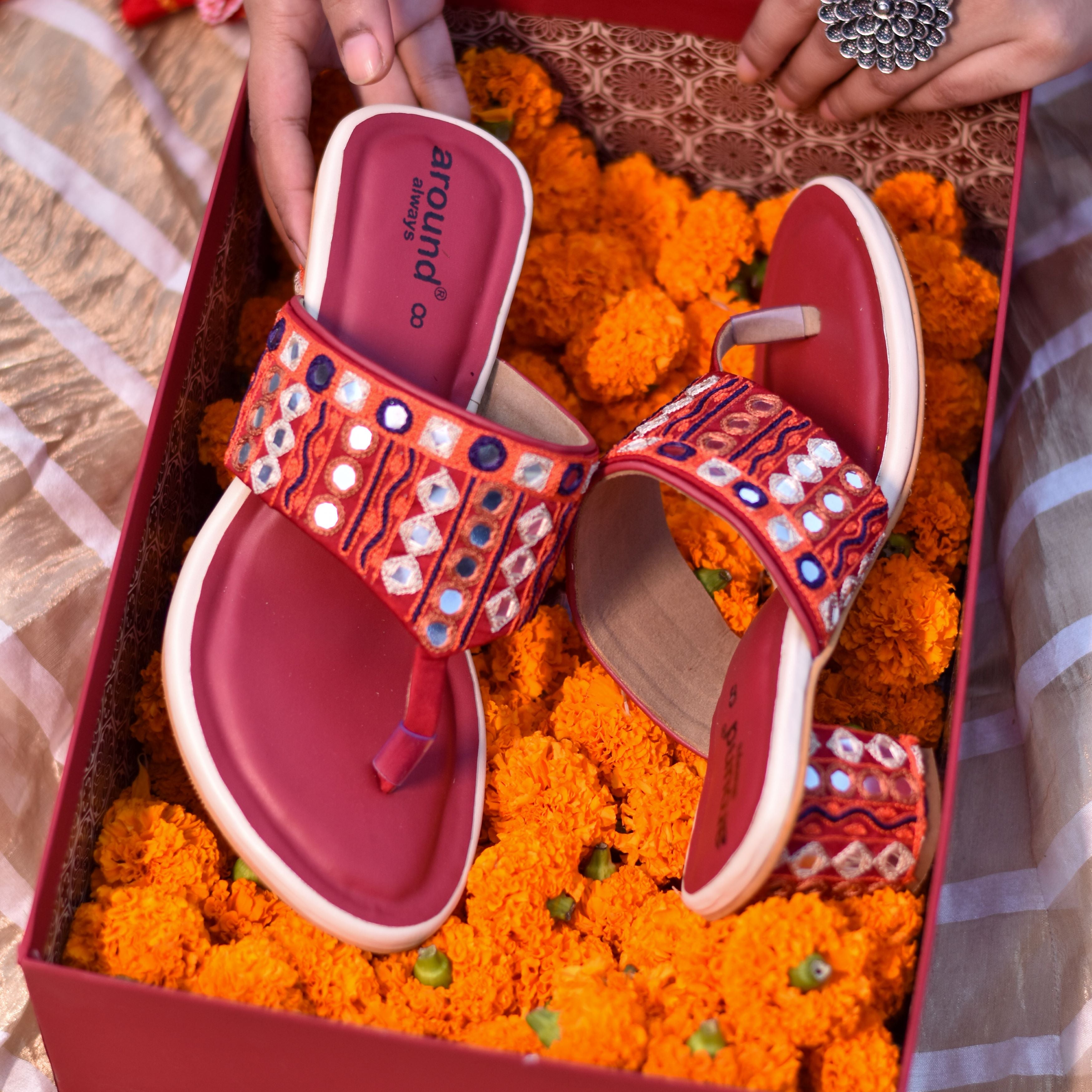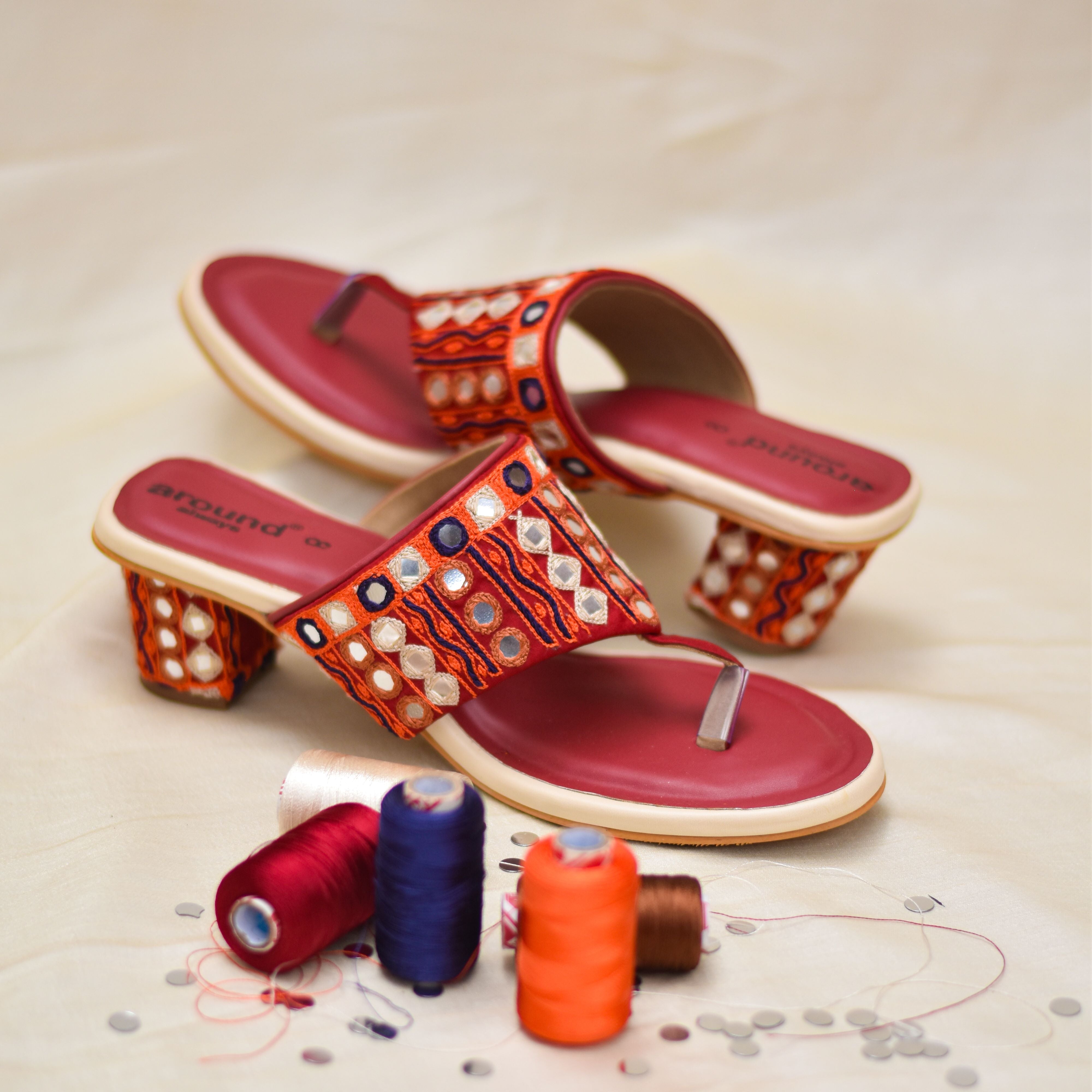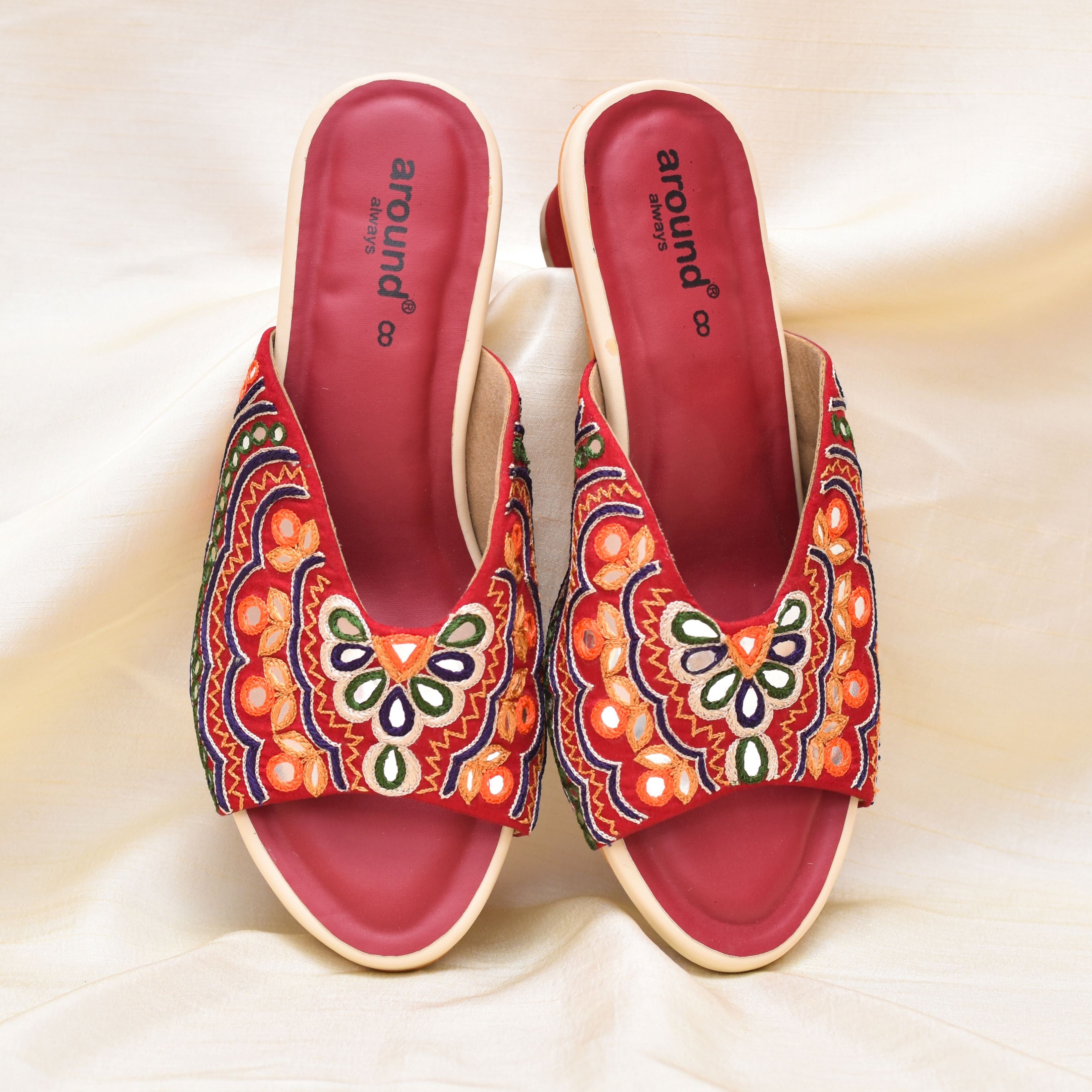 Multicolour red mirror work peep toe sandals for festivals like Navratri