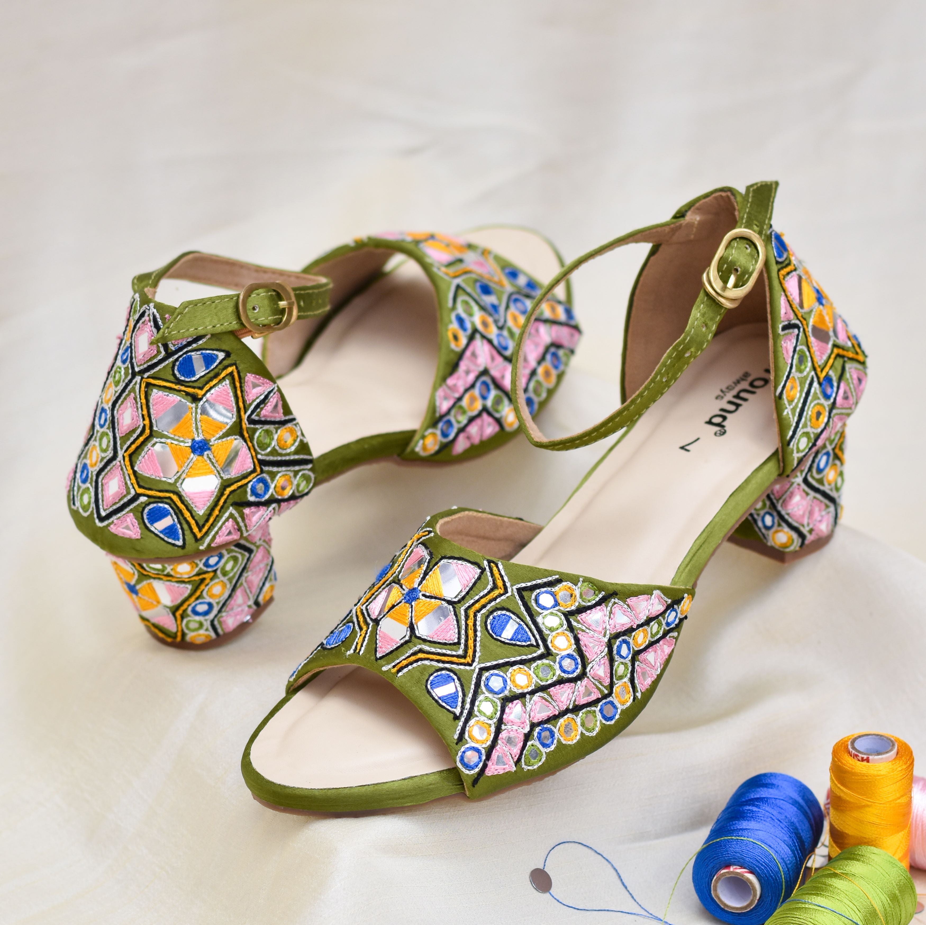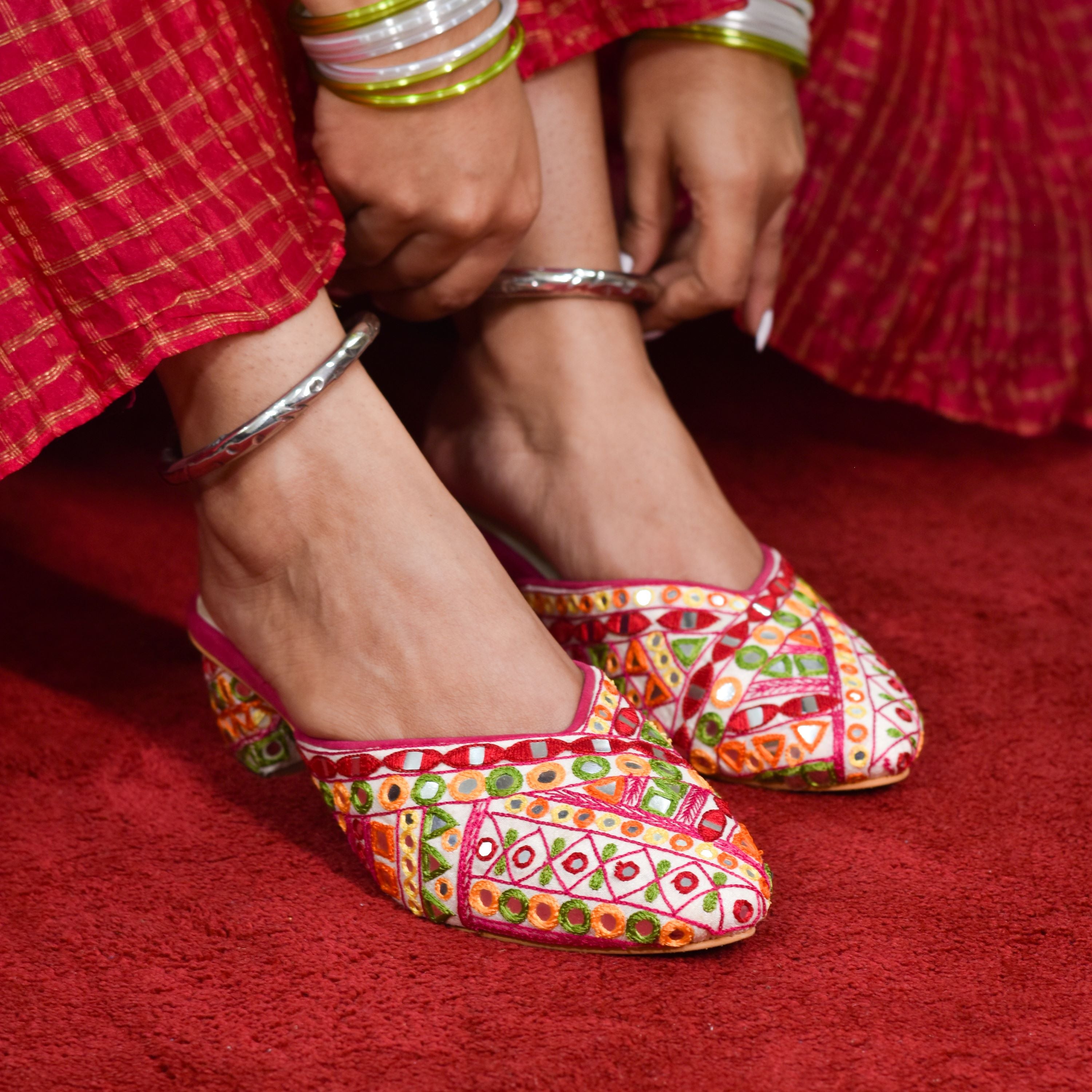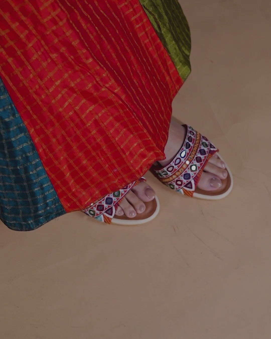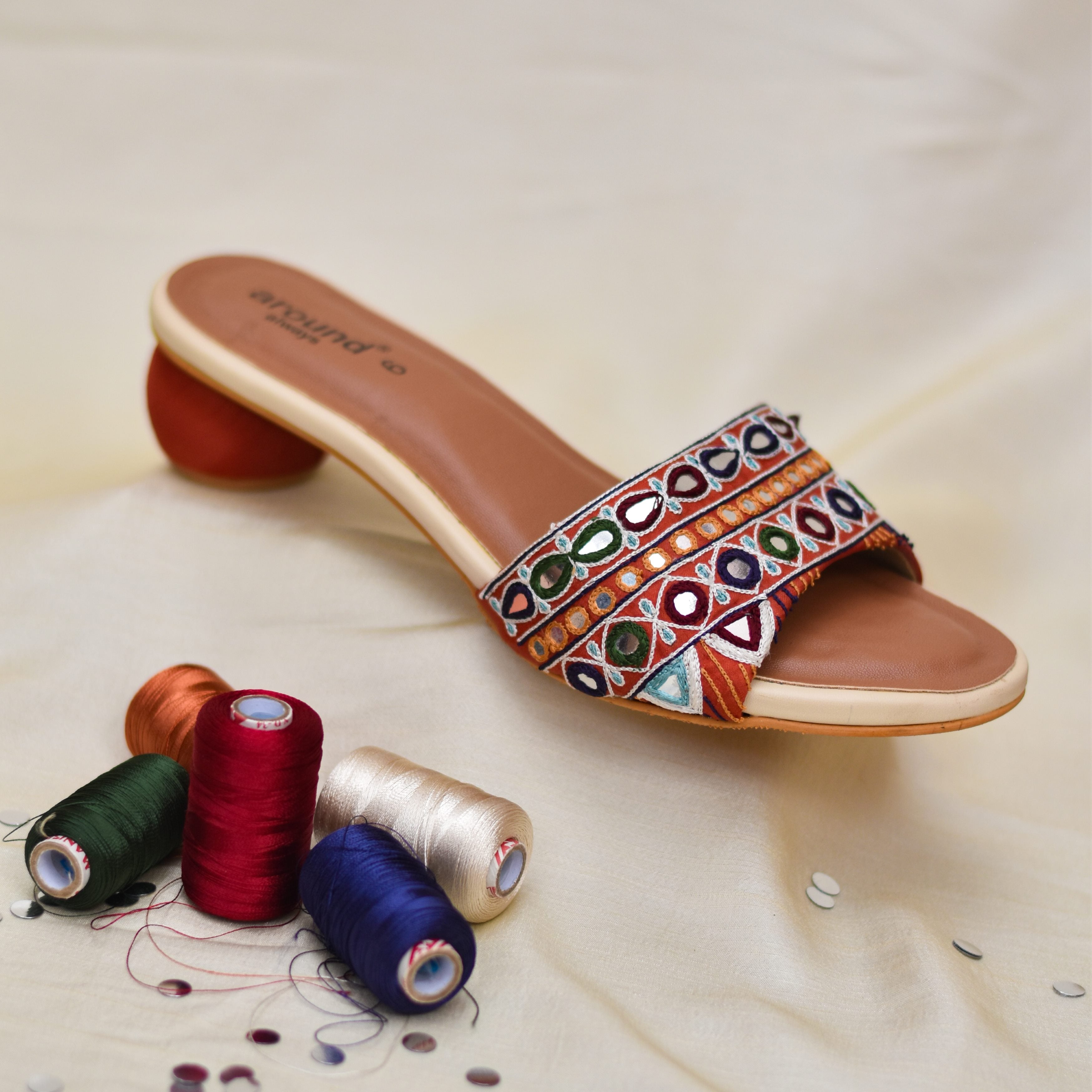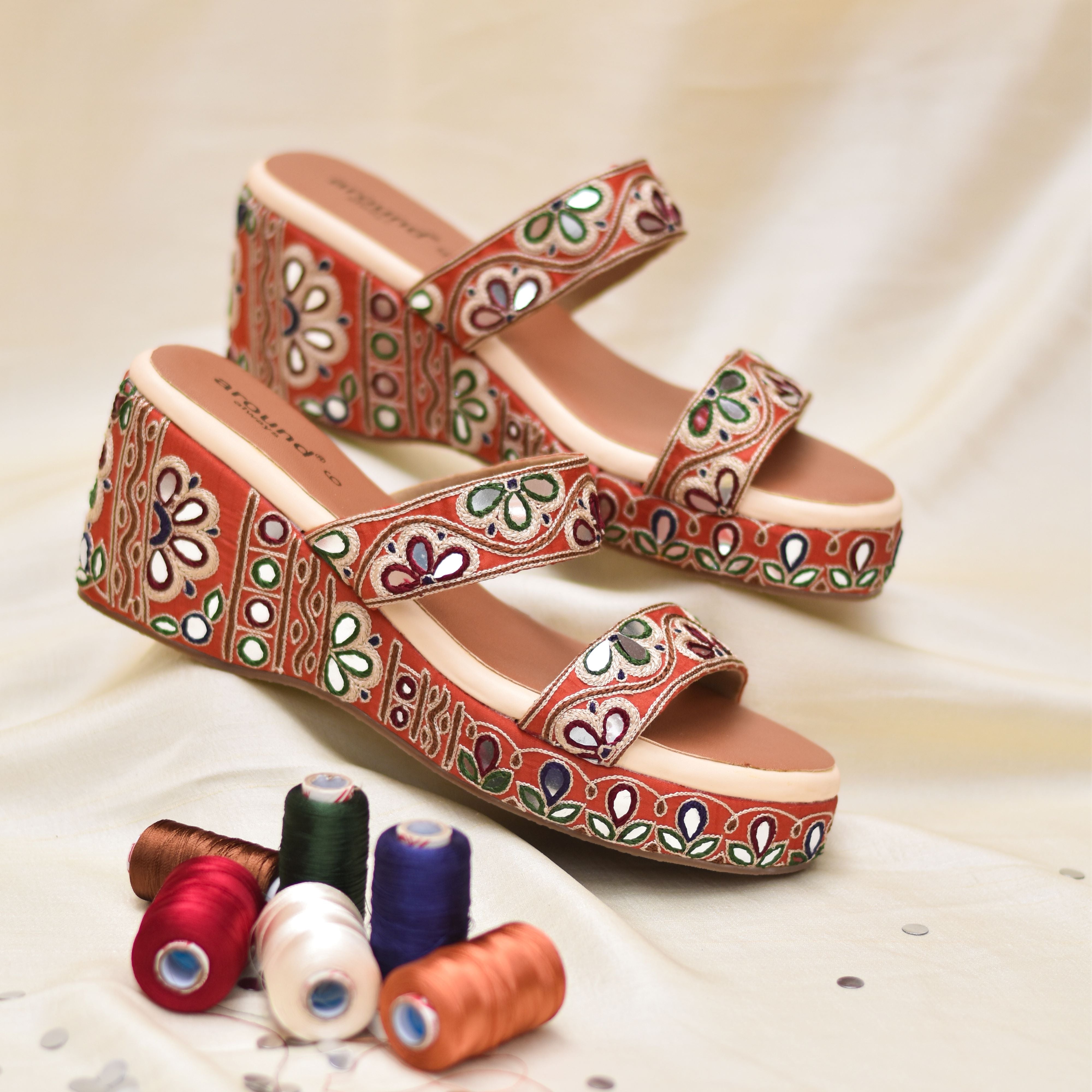 Multicolour red mirror work peep toe sandals for festivals like Navratri