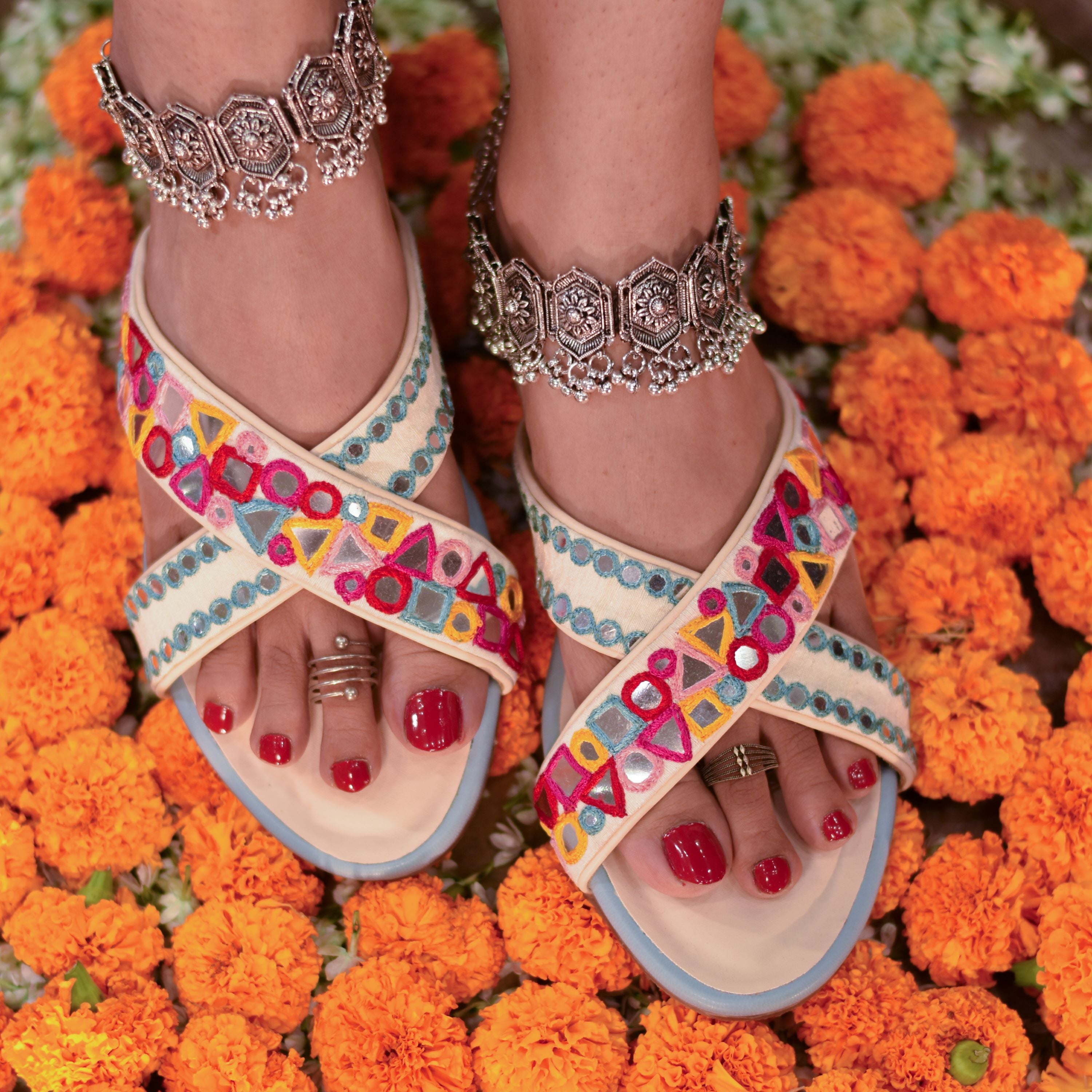 Dhara Peep Toe Sandals | Multicolour Threadwork Shoes