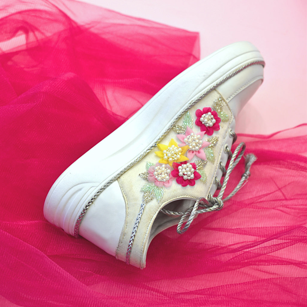 Beige wedding sneakers with pastel floral embroidery