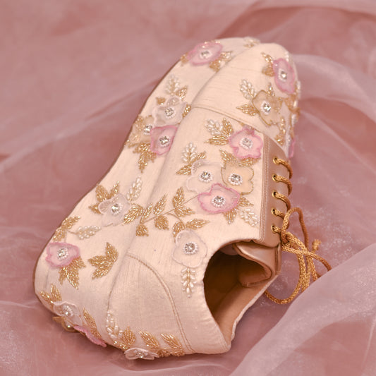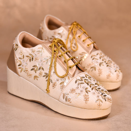 Designer champagne wedge sneaker with golden floral detailing and beadwork.