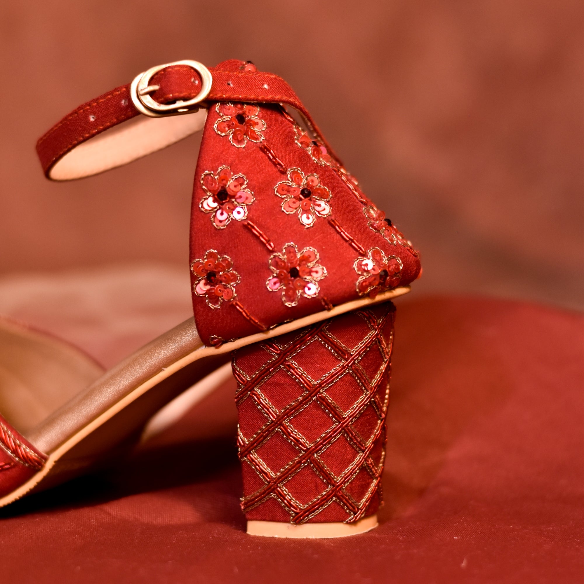 Red velvet bridal heels for Indian bride after