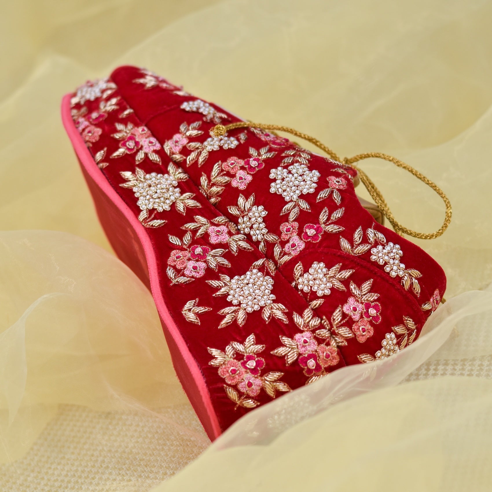 Comfortable Bride shoes in red and golden