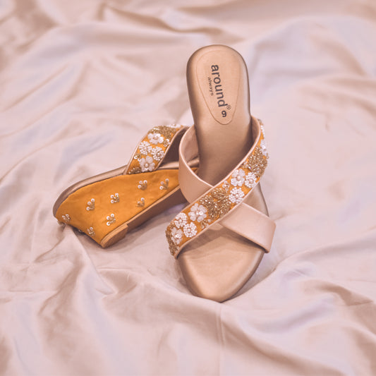 Victoria golden wedges featuring handcrafted embroidery and elegant bridal wedding heels.