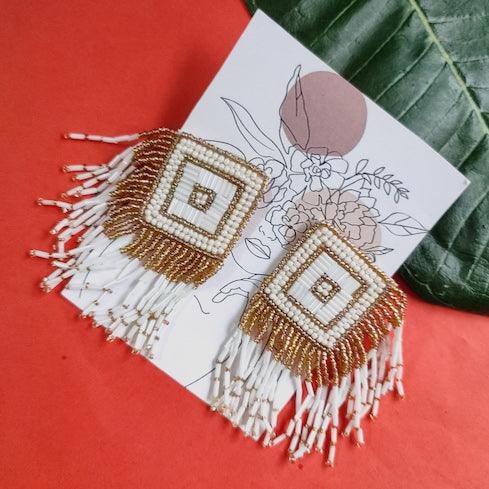 Diamond-shaped beaded earrings with a combination of white and gold beads and a bunch of latkans, not less than a dream indo-western earrings for any event. It can be paired with any outfit and make you feel complete. Handmade drop earrings which every girl should own. Grab these pairs and give your collection some quirky look.